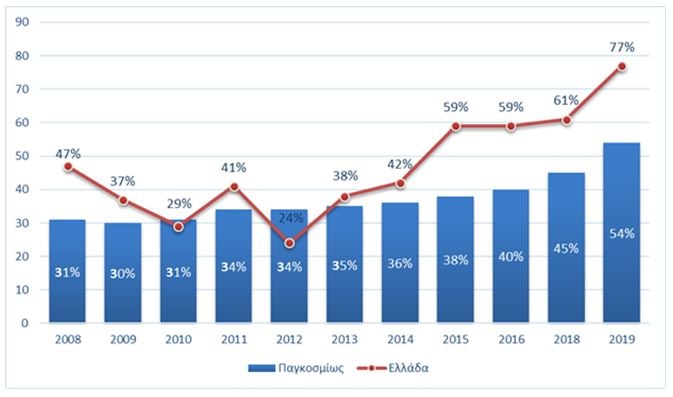 Πίνακας 1: Η Έλλειψη Ταλέντου στην Ελλάδα και παγκοσμίως, 2009 – 2019 (Πηγή: ManpowerGroup)