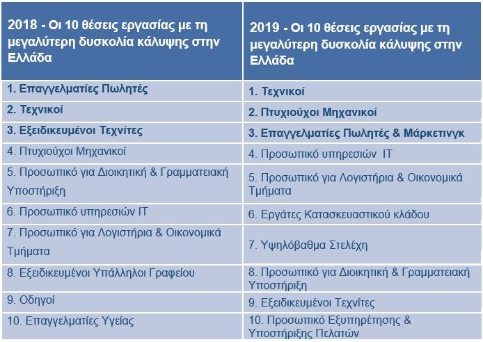 Οι θέσεις των «Τεχνικών» κατέχουν τα πρωτεία στη λίστα καθώς αποτελούν εκείνες με τη μεγαλύτερη δυσκολία κάλυψης στην Ελλάδα και «εκθρονίζουν» τους «Επαγγελματίες Πωλητές», που βρίσκονταν στην 1η θέση από την έναρξη της έρευνας το 2008. Για πρώτη φορά στην κατηγορία των επαγγελματιών Πωλητών προστίθενται και ρόλοι του Marketing όπου μεταφέρονται στην 3η θέση. Στη 2η θέση βρίσκονται οι «Πτυχιούχοι Μηχανικοί» που τοποθετούνταν στην 4η θέση της κατάταξης το 2018.