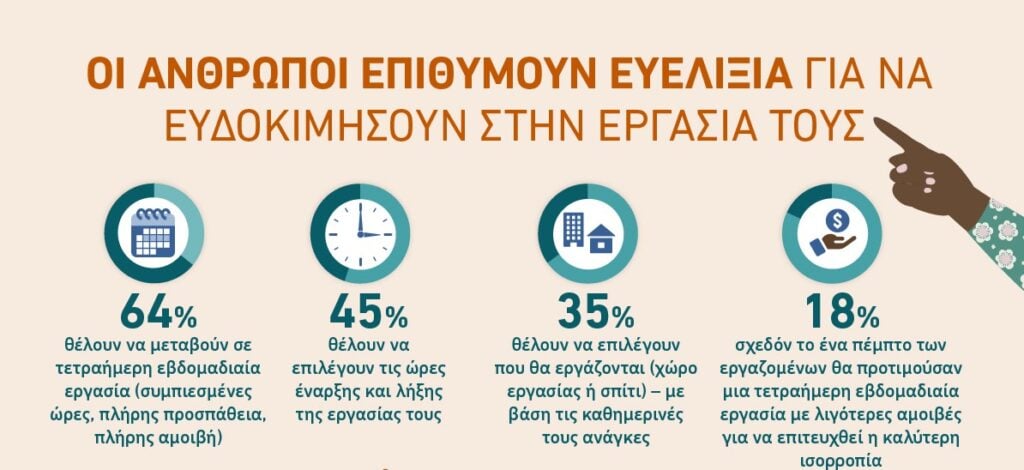 - Σχεδόν το 1/5 των εργαζομένων (18%) θα προτιμούσαν να εργάζονται 4ήμερη εβδομάδα με λιγότερες αποδοχές