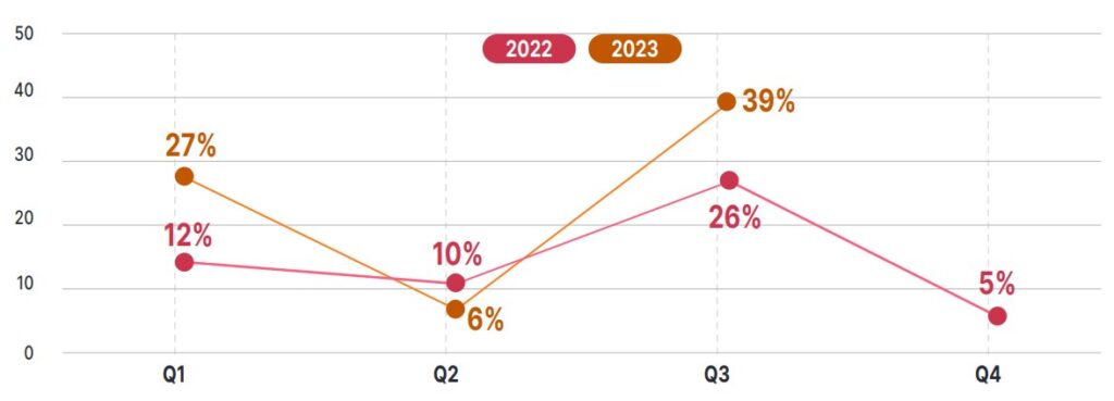 Είναι προφανές ότι το 3ο τρίμηνο του 2023 παρατηρείται στην Ελλάδα αύξηση προθέσεων στις προσλήψεις στον κλάδο της Πληροφορικής (39%), συγκριτικά με το αμέσως προηγούμενο τρίμηνο όπου οι προθέσεις προσλήψεων ανέρχονταν στο +6%, ενώ το διάστημα Ιανουάριος-Μάρτιος του 2023 στο +27%.